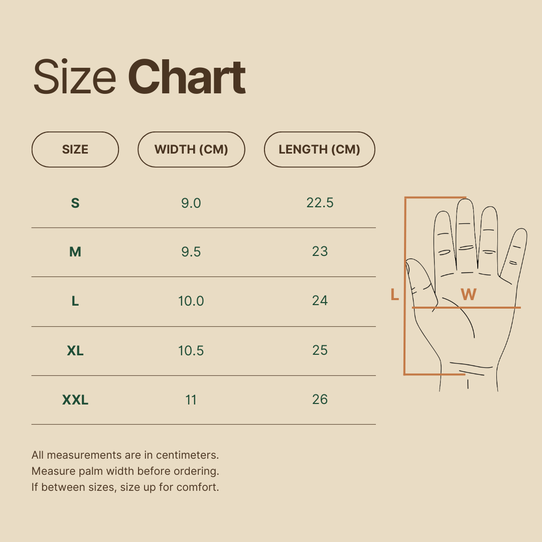 • Width (W): Measure across the widest part of your palm (excluding thumb).
